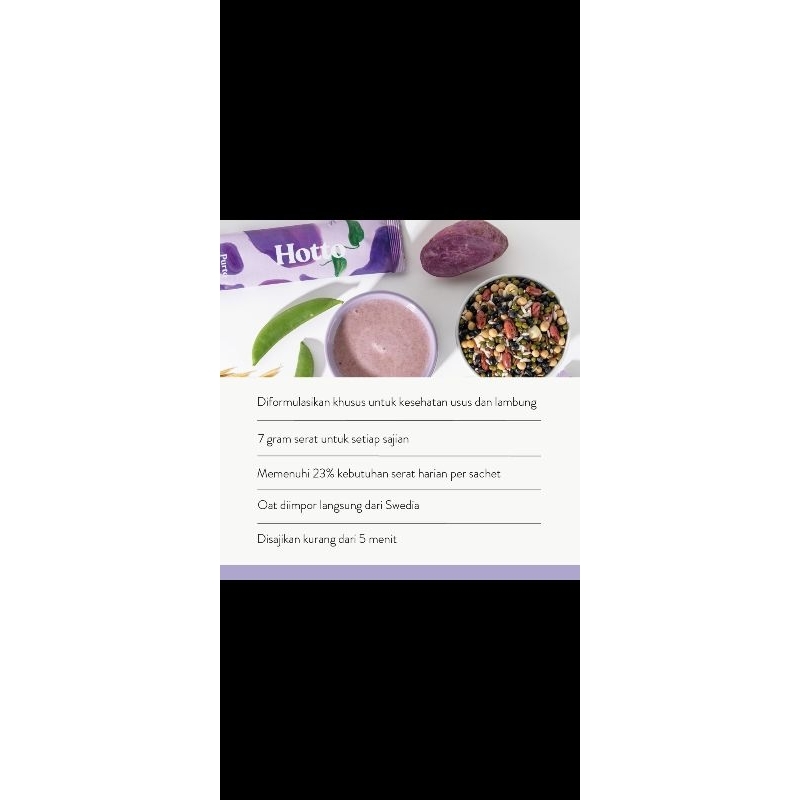 Hotto Purto Oat merupakan minuman kesehatan tinggi serat yang kaya akan nutrisi dan rendah kalori. Diformulasikan secara khusus dengan bahan-bahan premium seperti ubi ungu, oat dari Swedia, serta 15 biji-bijian (multigrain). Merupakan pilihan yang tepat untuk dijadikan sarapan praktis untuk keluarga tercinta.
