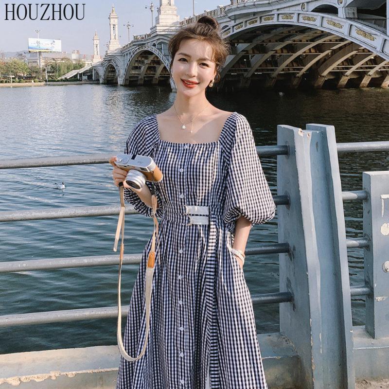 HOUZHOU Клетчатое платье Женщины Миди Платье с пышным рукавом Лето Vinatge Французская элегантная квадратная шея Высокая талия A-line Офис Женский классический тренд