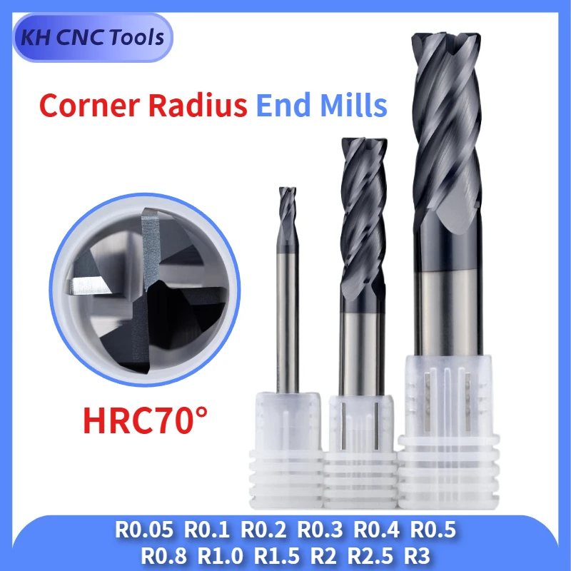 HRC70° R0.05 R0.1 R0.2 R0.3 R0.5 R1 R2 R2.5 R3 Corner Radius End Mill Cutter for Steel Machining 4 Flutes Carbide Tungsten Steel