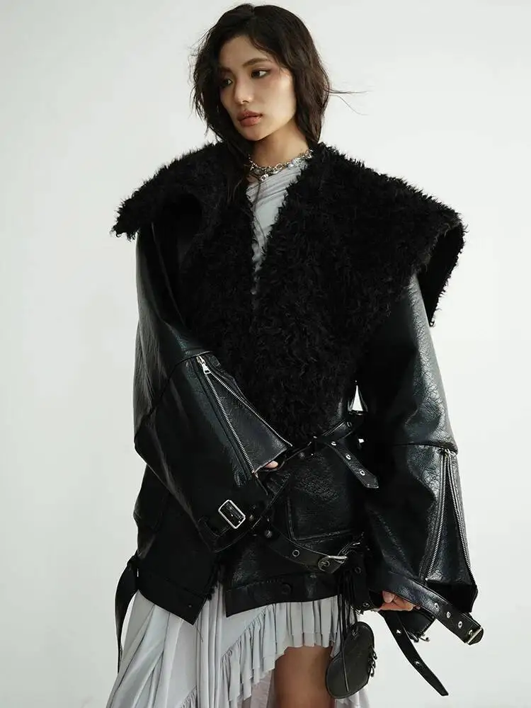 HUISONG черная толстая овечья шерсть, большой размер, куртка из искусственной кожи, новое женское пальто с лацканами и длинными рукавами, модное пальто, осень-зима 2025 dsudd0