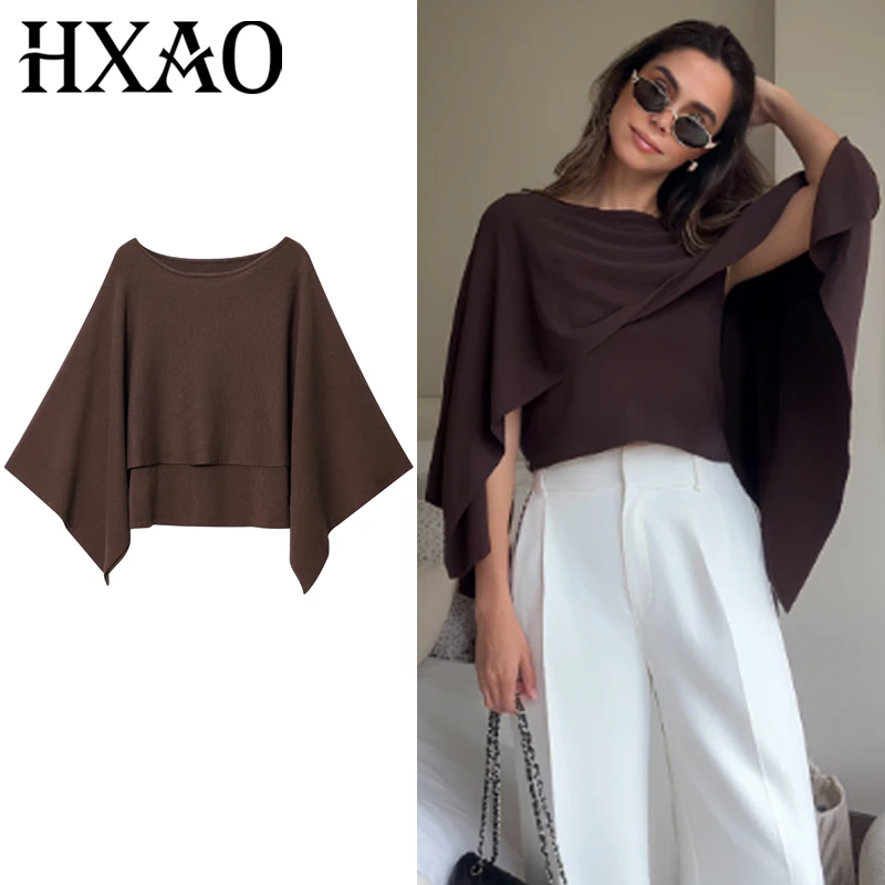 HXAO Вязаная коричневая накидка, женская пончо, осень 2025 г., модное болеро, многослойное плащ, накидка и пончо, шикарное и элегантное женское пальто, укороченная шаль