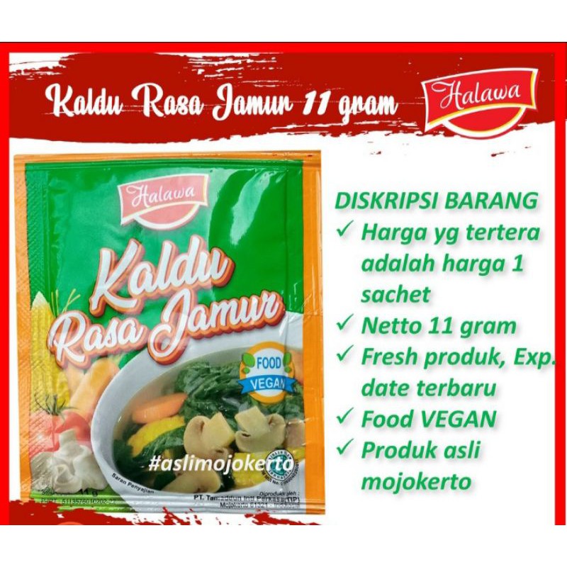 Kaldu rasa jamur halawa, dibuat dengan bahan alami, membuat masakan anda lebih lezat dengan aroma jamur yang harum dan menggugah selesar. Sangat pas untuk bermacam macam jenis masakan seperti tumis, sop, dimsum dan lain-lain