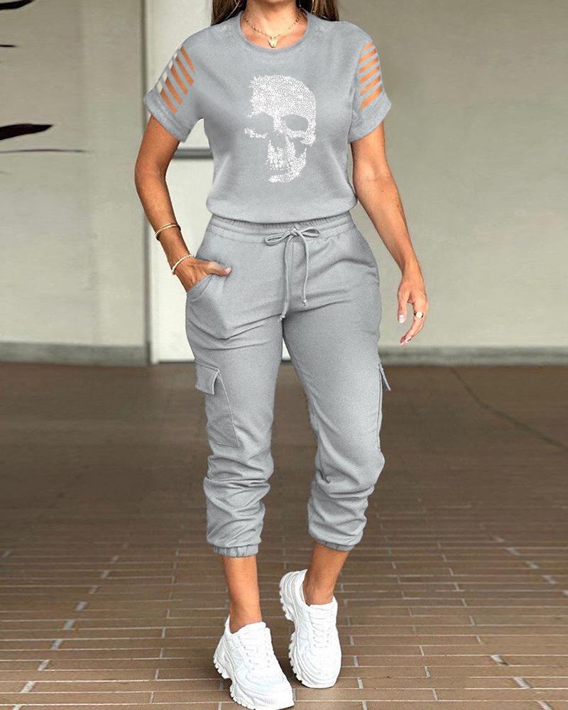 Halloween Rhinestone Skull Pattern Cutout Top & Drawstring Pants Set, Gray