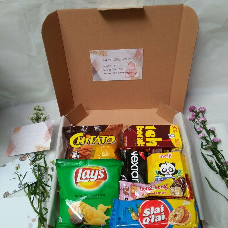 kami menyediakan Hampers Box Snack ukuran Medium. Cocok untuk bingkisan wisuda, ultah, anniversary, dll