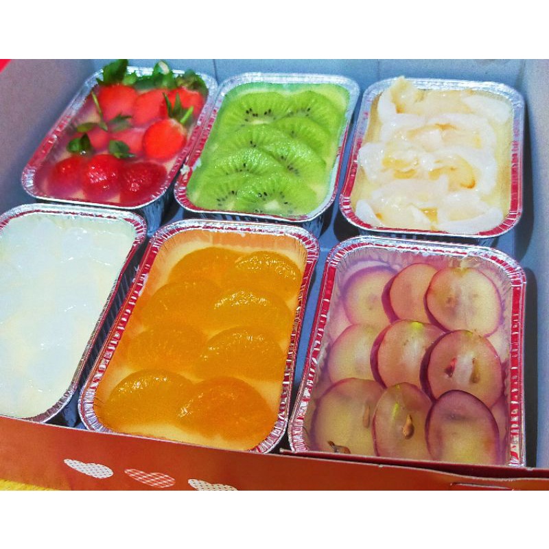 Sajian yg begitu menggoda , Puding buah isi 6 , dalam box uk 28*28 cm, di padu dng vla dan buah2an segar membuat sajian ini banyak pengemar nya ,cocok untuk sajian ,bingkisan ,hantaran ,party dll, terbuat dari bahan2 berkwalitas premium dan buah2an segar , vla susu yg pas manis dan gurih nya .dikemas dalam box yg di hias pita
