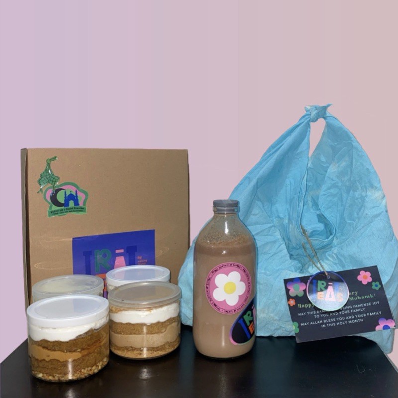 treats hampers bag with choices of 4 jars of cake in jar & 500ml drinks or 3 jars of cake in jar, 2 treats cookies & 500ml drinks