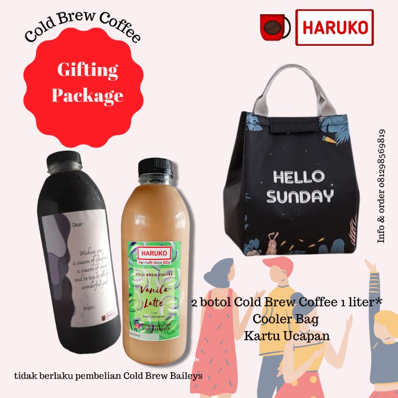 2 botol kemasan 1 liter ( pilih rasa Original Black, Salted Caramel Latte dan Vanila Latte ) , 1 Cooler Bag, kartu ucapan