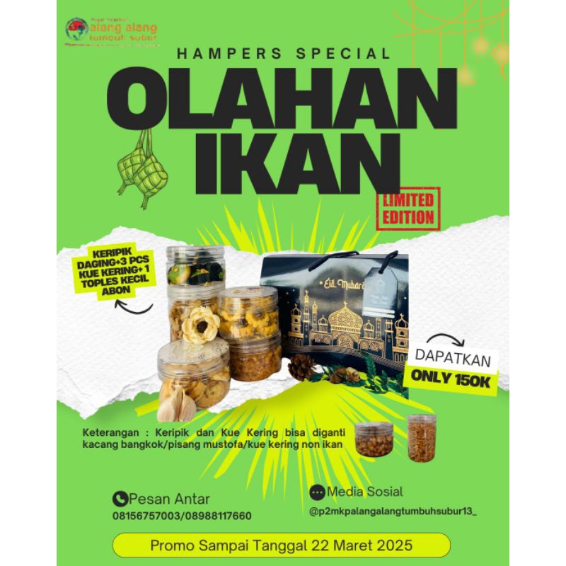 Alang - Alang Tumbuh Subur menyediakan berbagai pilihan jenis hampers dengan harga yang sangat terjangkau, cocok bangett untuk menemani moment hari raya kaliannn!!! di paket hampers ini berisi 4 produk yang dikemas dengan toples dan dengan varian rasa dominan manis dan gurih.