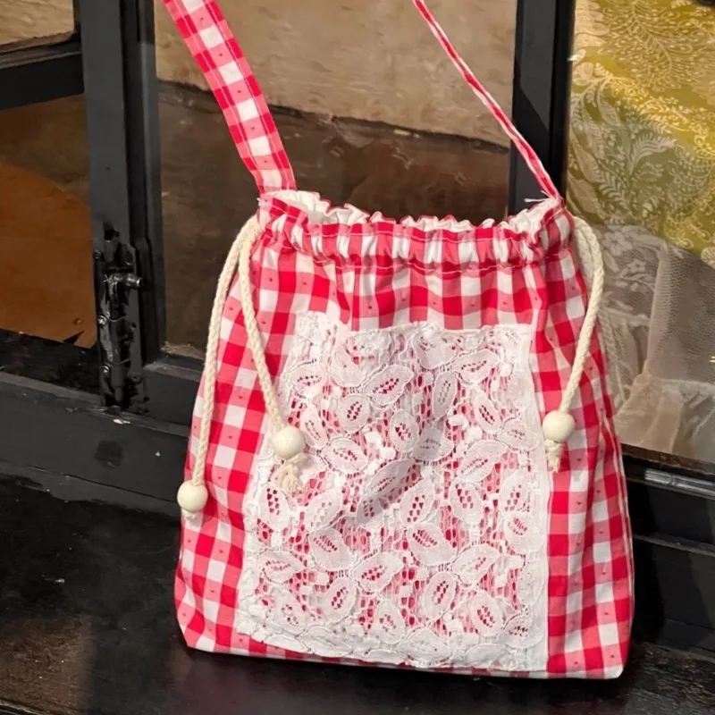 Harajuku красная клетчатая сумка на плечо женская кружевная лоскутная ткань на шнурке большая вместительная сумка через плечо женские милые милые сумки 2025