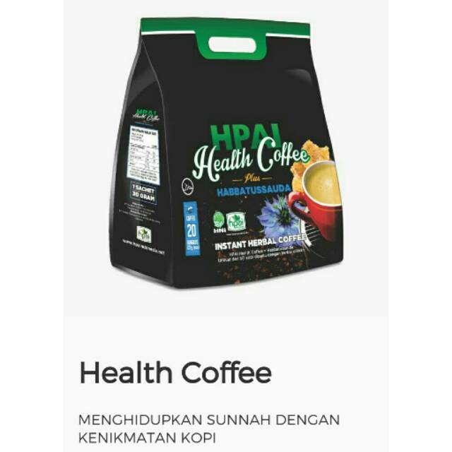 HPAI HEALTH COFFEE plus Habbatussauda adalah kopi yang diracik secara khusus yang kaya manfaat sehingga dapat menjaga stamina dan vitalitas tubuh untuk aktifitas maksilmal setiap hari. Kopi ini terbuat dari biji kopi alami yang dipadu dengan herbal pilihan, yaitu biji habbatussauda, madu, propolis, susu kambing, pasak bumi, dan cokelat.