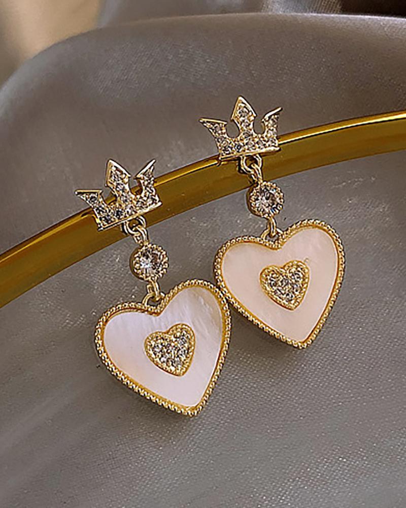 Heart Crown Pattern Rhinestone Dangle Drop Earrings, Gold