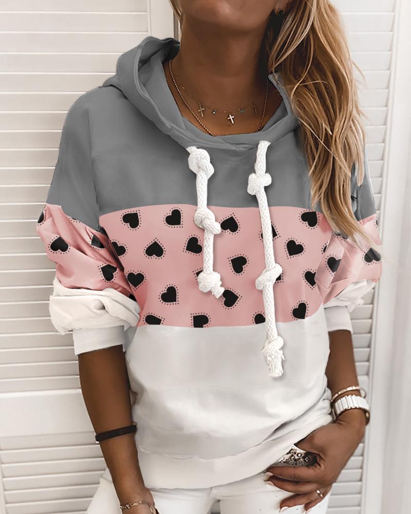 Heart Print Colorblock Hooded Casual Sweatshirt, Pink