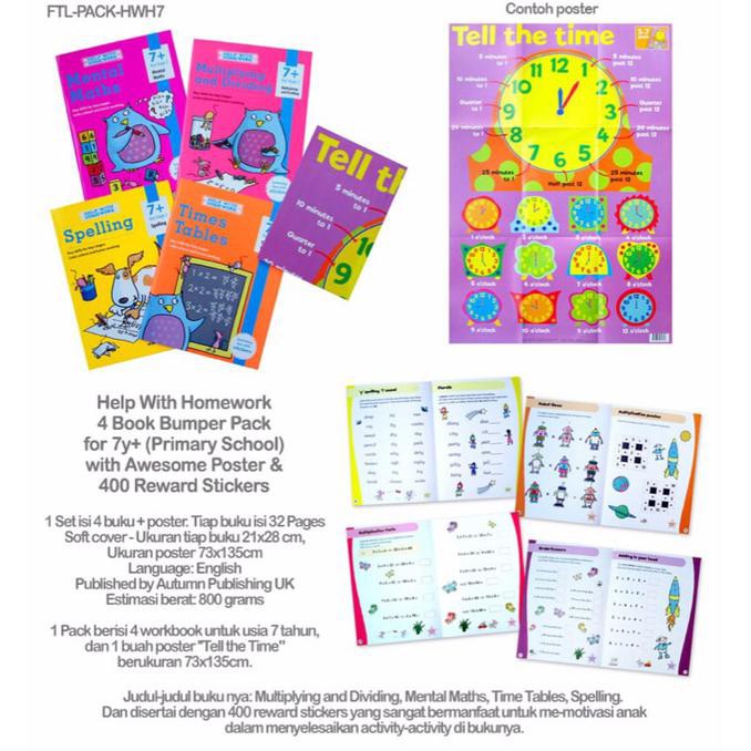 1 Pack berisi 4 workbook untuk usia 7 tahun, dan 1 buah poster "Tell the Time" berukuran 73x135cm.