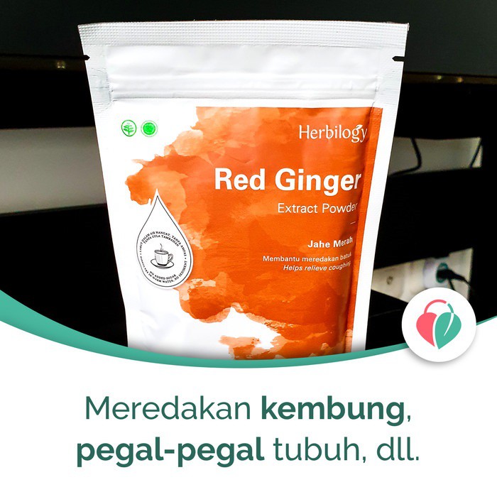 Bubuk Ekstrak Herbilogy Jahe Merah dapat membantu meredakan batuk, meningkatkan daya tahan tubuh, mengatasi flu, masuk angin, dan badan pegal-pegal.