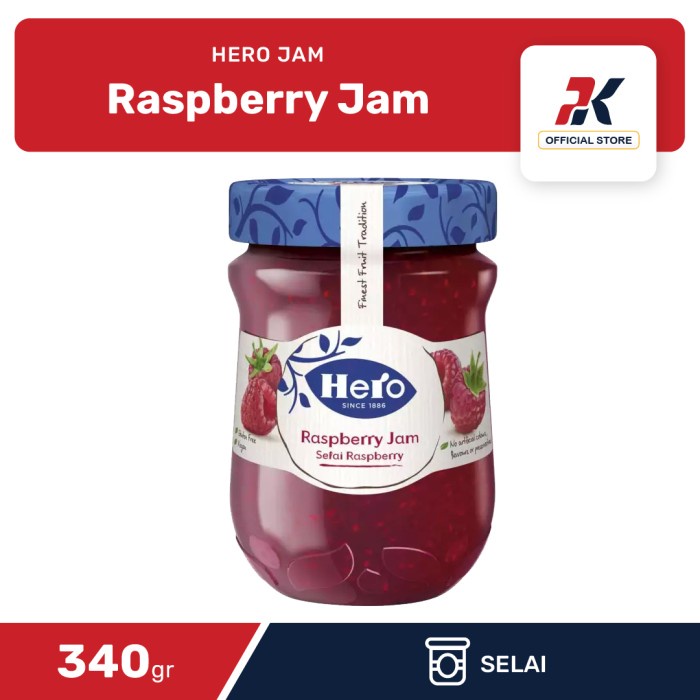 Selai Hero Raspberry, dengan buah-buahan pilihan, bersumber dari petani terpercaya. Bersulang dengan nikmat, sebagai topping untuk panekuk Anda atau kreasi makanan penutup Anda Selai Raspberry Hero dengan raspberry kami tumbuh secara alami di tanah asli dan udara segar Eropa, bersumber dari petani tepercaya untuk memberi Anda produk dengan kualitas, rasa, dan warna yang konsisten. Disiapkan dengan cara tradisional tanpa pewarna, perasa atau pengawet buatan, setiap sendok selai Hero mengandung kejernihan sinar matahari dan keharuman buah.