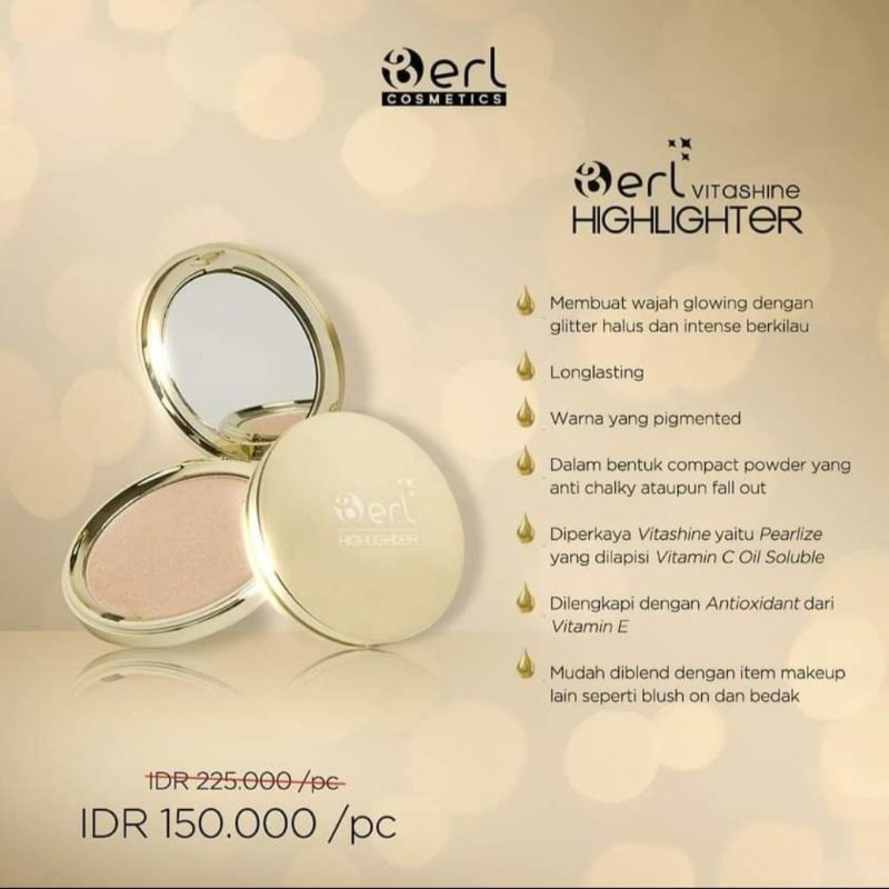 Kulit wajah yang SEHAT dan GLOW UP hanya bisa dimiliki oleh wanita Korea dengan image kecantikan glass skin mereka? Sekarang, saatnya kalian Wanita Indonesia juga bisa MEWUJUDKAN impian kulit tampak sehat berkilau, dears.. ♀ Dipersembahkan special untukmu, B ERL VITASHINE HIGHLIGHTER Apa sih B ERL VITASHINE HIGHLIGHTER itu? Merupakan produk highlighter dari B Erl Cosmetics yang tidak hanya berfungsi sebagai riasan wajah untuk memberikan kesan kulit sehat, glowing dan tampak berdimensi namun juga memiliki nutrisi didalamnya. Apa saja kandungan nutrisi didalamnya? Formulasi VITASHINE merupakan gabungan dari Vitamin dan Shine. Karena ada kandungan Vitamin E yang kaya akan Antioxidant untuk lindungi kulit wajah kita dari efek buruk sinar UV dan Zat Radikal Bebas yaitu munculnya tanda-tanda penuaan dini seperti flek hitam, kulit kendur dan garis kerutan di wajah. Ditambah lagi kandungan Vitamin C Oil Soluble yang larut dalam minyak sehingga makeupmu mudah