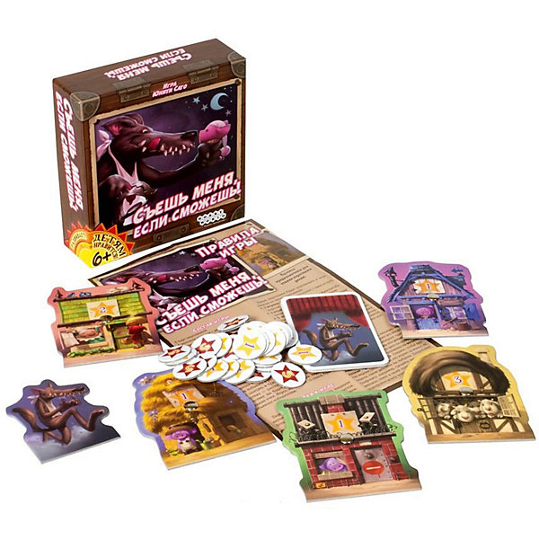Игра Hobby World «Съешь меня, если сможешь!» выполнена по мотивам известных сказок, где фигурирует злой серый волк. Распределяя роли охотника и добычи, дети и взрослые получат массу положительных эмоций, добывая жетоны со звездочками. Чтобы победить, им нужно проявить хитрость и смекалку, отбиваясь от волка и посещая домики хороших персонажей.