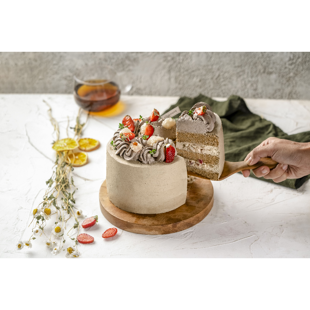 Perpaduan unik antara rasa panggang bolu hojicha dan isian hojicha sangat selaras. Di atasnya diberi lapisan krim Hojicha, thyme dan daun emas dengan leci eksotis dan stroberi segar.