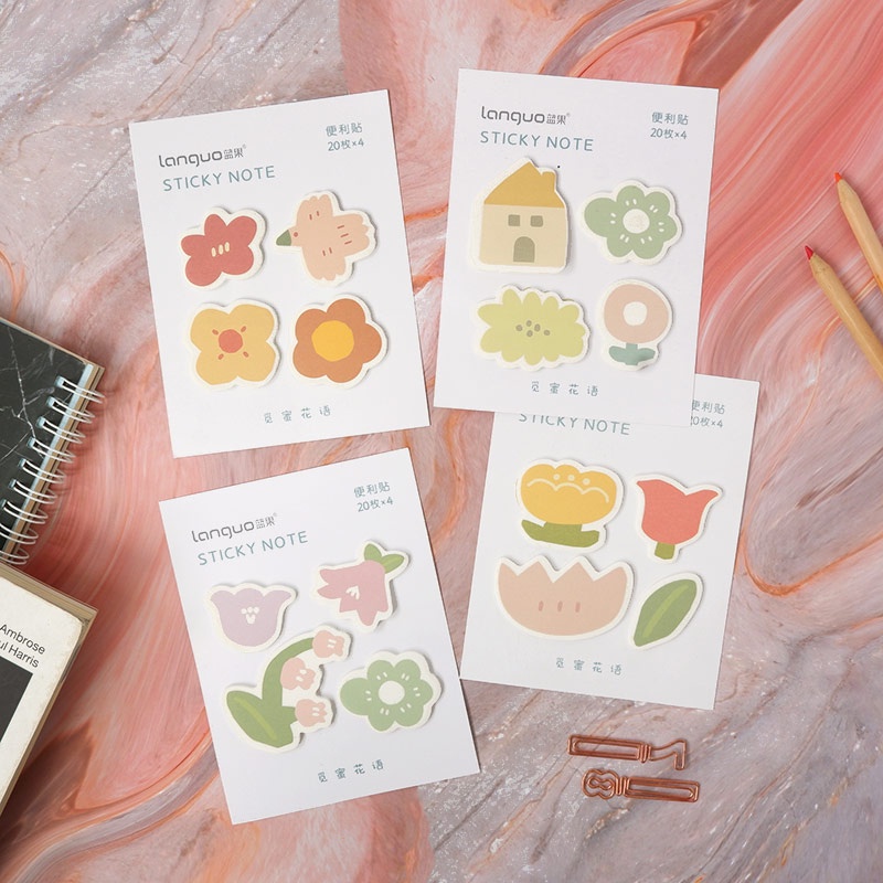 Sticky notes (catatan tempel) seri Honey Flower Language ini dibuat berbentuk bunga dengan warna pastel halus.