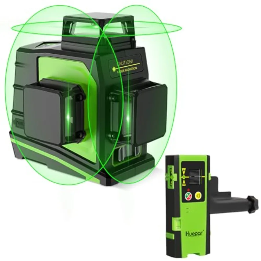 Huepar 3D Green Beam Self-Leveling Laser Level 3x360 Cross Line with Laser Receiver Leveling and Alignment Tool-Two 360 Vertica