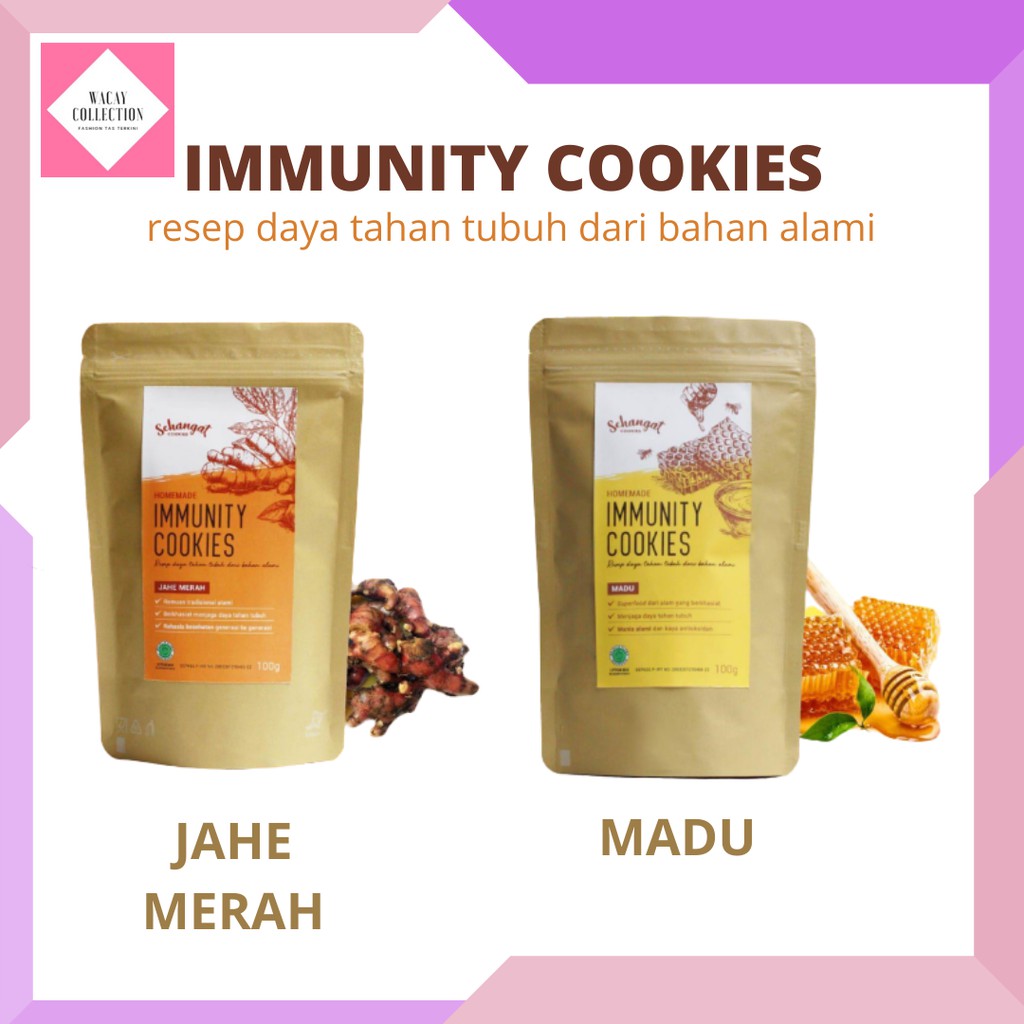 IMMUNITY COOKIES memiliki 2 varian rasa yaitu Jahe Merah dan Madu Tanpa Tambahan Pengawet, Pewarna dan Perasa