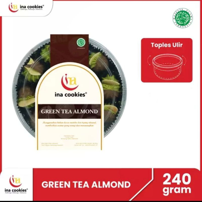 Kue kering manis favorit dari Ina Cookies dengan rasa unik green tea / matcha yang khas, rasa gurih butter, margarin, tepung sagu dan cornflakes, dengan topping potongan almond serta cokelat leleh yang pastinya bakal selalu berkesan di lidah.