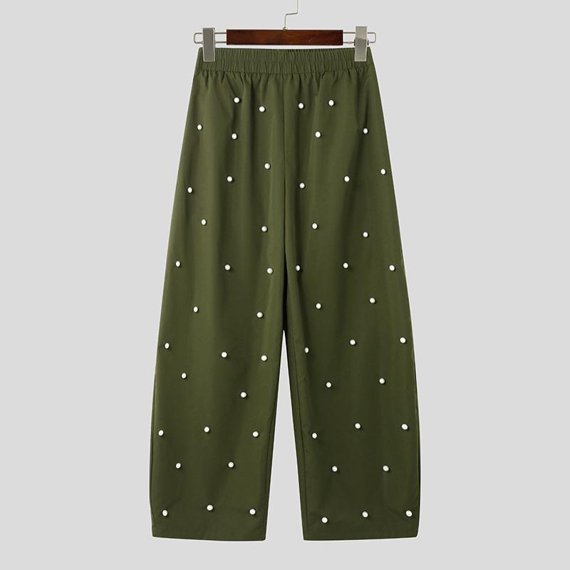 INCERUN Мужские брюки большого размера с эластичной талией, спереди жемчужная отделка, пэчворк, повседневные длинные брюки 3XL зелёный