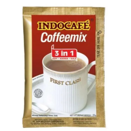 Produk Indocafe dengan perpaduan kopi, krimer, dan gula yang pas.