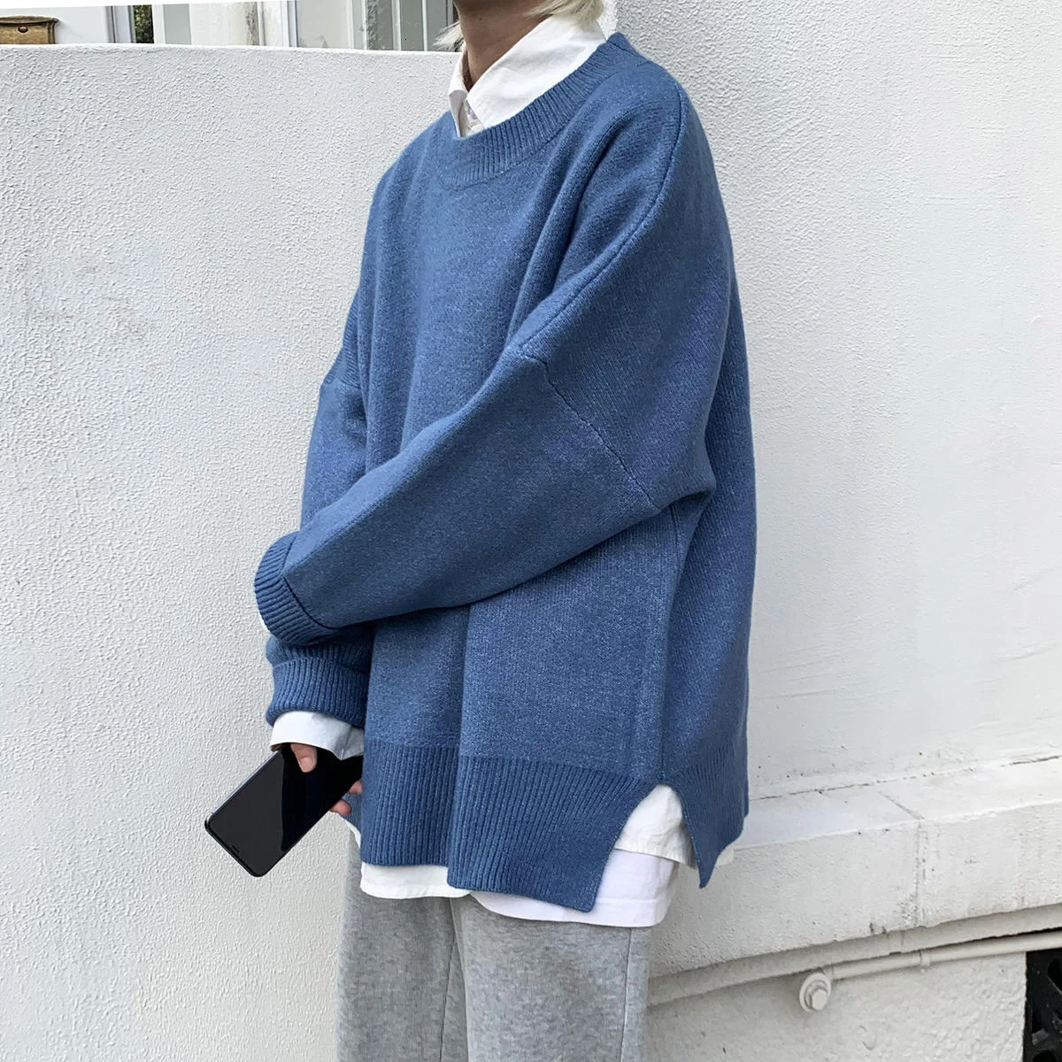 Retro Ribbing Knitted Sweater Women Half High Collar Solid Colors Long Loose Casual Knitted Pullovers Autumn Winter Warm Clothes