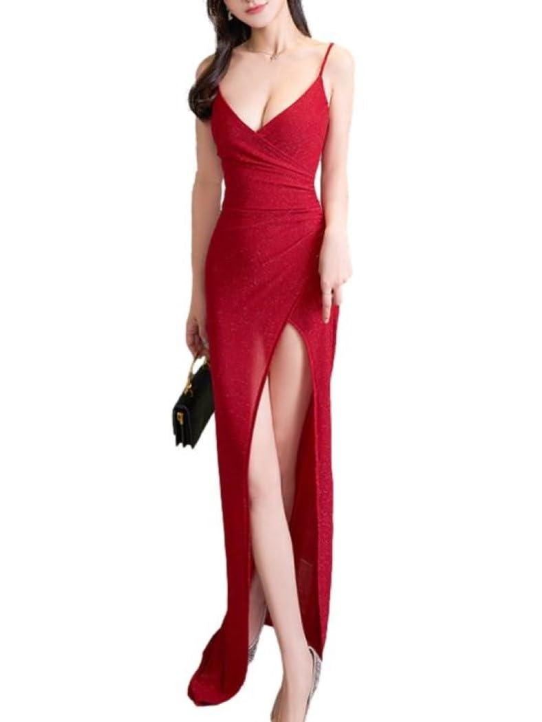 ISLAYCAOLILA Длинное платье макси без рукавов для вечеринки в кабаре, EC7 Платье женское Fabi, Платье, Платье, Облегающее, Длинное, С разрезом, На бретелях, Платье, (Размер L, Красный)