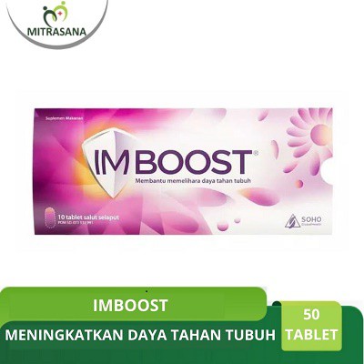 DeskripsiImboost merupakan suplemen yang digunakan untuk terapi suportif agar daya tahan tubuh meningkat dan memulihkan kondisi setelah sakit.Imboost mengandung Echinaceae dan Zinc Picolinate. Keduanya memiliki mekanisme kerja sebagai berikut: - Echinaceae yang diketahui hidup di utara Pegunungan Roxy Amerika Serikat merupakan tanaman herbal yang berkhasiat mengatasi flu, coomon cold, dan infeksi saluran pernapasan atas lainnya. Selain berperan menurunkan peradangan tubuh yang memicu serangan flu, tanaman herbal ini juga diketahui dapat meningkatkan dan menstimulasi daya tahan tubuh. - Zinc Picolinate adalah salah satu zinc yang mudah diserap tubuh dari berbagai jenis zinc yang ada. Seperti kinerja zinc pada umumnya, zat asam ini dapat membantu meningkatkan daya tahan tubuh (immunodulator) dan berperan sebagai anti infeksi karena kemampuan antimikrobanya. Indikasi / Manfaat / Kegunaan : - Meningkatkan sistem kekebalan tubuh terhadap infeksi bakteri pada saluran pernapasan atas dan urogenital (kandidiasis dan vaginitis) yang berulang. - Sebagai terapi suportif untuk meningkatkan daya tahan tubuh setelah sakit. - Mencegah kambuhan infeksi saluran pernapasan dan urogenital. - Meringankan gejala flu, salesma, bersin-bersin, dan alergi hidung.KomposisiEchinaceae 250mg, Zn picolinate 10 mgDosis2-3 x sehari 1 tabletPenyajianBerikan sesudah makanPerhatianPenyakit autoimun, pasien penerima transplantasi yang mendapat obat imunosupresanEfek SampingGangguan lambung ringan dan reaksi alergi