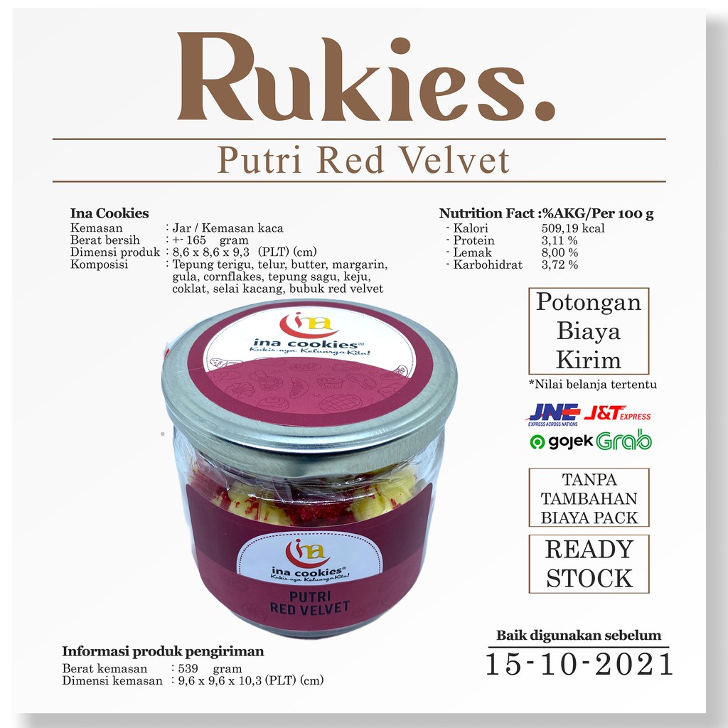 Komposisi : Tepung terigu, telur, butter, margarin, gula, cornflakes, tepung sagu, keju, cokelat, selai kacang, bubuk red velvet