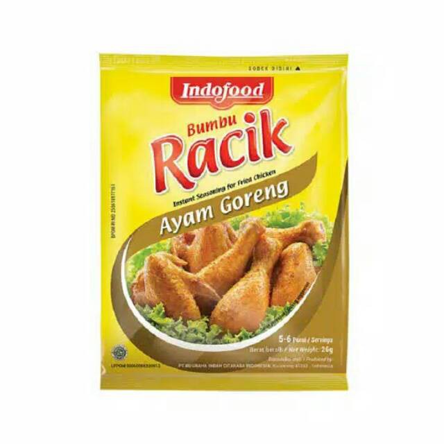 Indofood Bumbu Racik Ayam Goreng adalah salah satu unsur wajib pelengkap masakan yang sudah dikenal sejak dahulu kala. Sejak masyarakat mengenal bumbu, cara masak pun mengalami perubahan. Masakan yang dibubuhi bumbu akan terasa lebih lezat dibandingkan dengan masakan yang dimasak tanpa menggunakan bumbu yang akan terasa hambar di lidah. Namun, saat ini racikan bumbu sudah banyak kita jumpai di berbagai minimarket, Bumbu Racik misalnya. Bumbu praktis satu ini dapat memudahkan Anda dalam hal mengolah berbagai makanan.