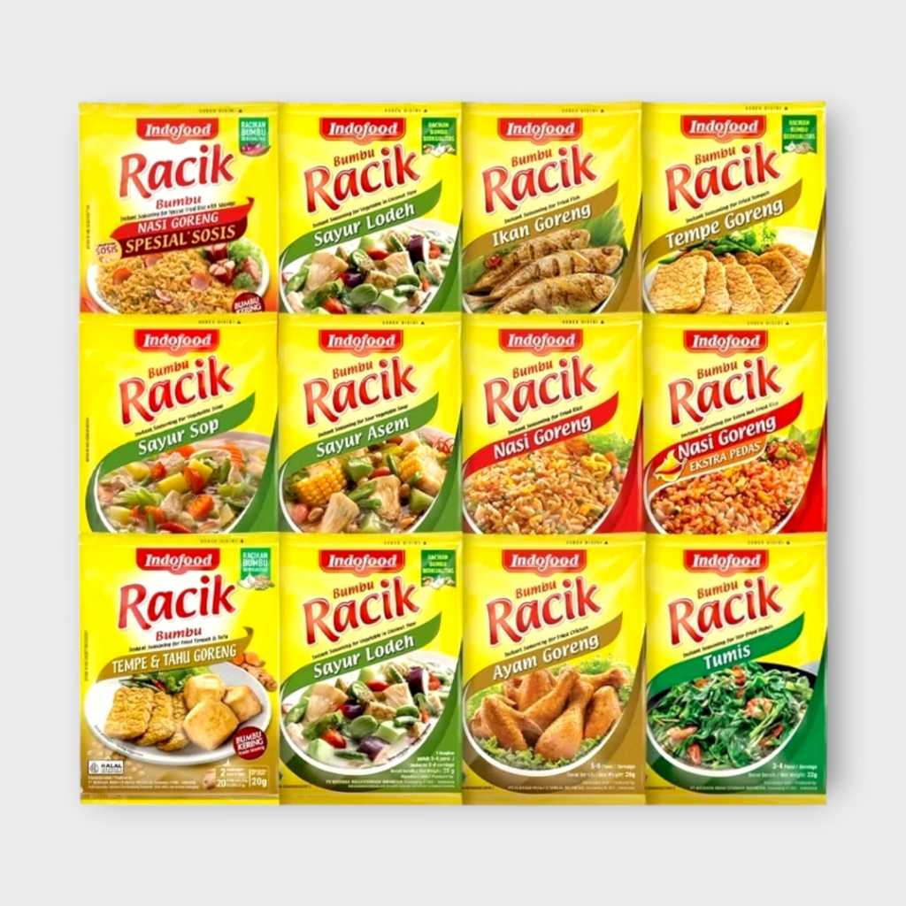 Bumbu Racik Indofood hadir sebagai solusi dalam pembuatan menu sehari-hari yang lezat dan nikmat. Bumbu Racik Indofood terbuat dari bumbu dan rempah-rempah asli yang telah dikeringkan tanpa penambahan bahan pengawet dan pewarna.