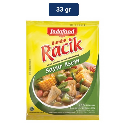 Indofood Bumbu Racik Sayur Asem 33gr merupakan bumbu instan untuk membuatsayur asem yang nikmat. Diproses secara higenis dan praktis BPOM: MD 255610185161