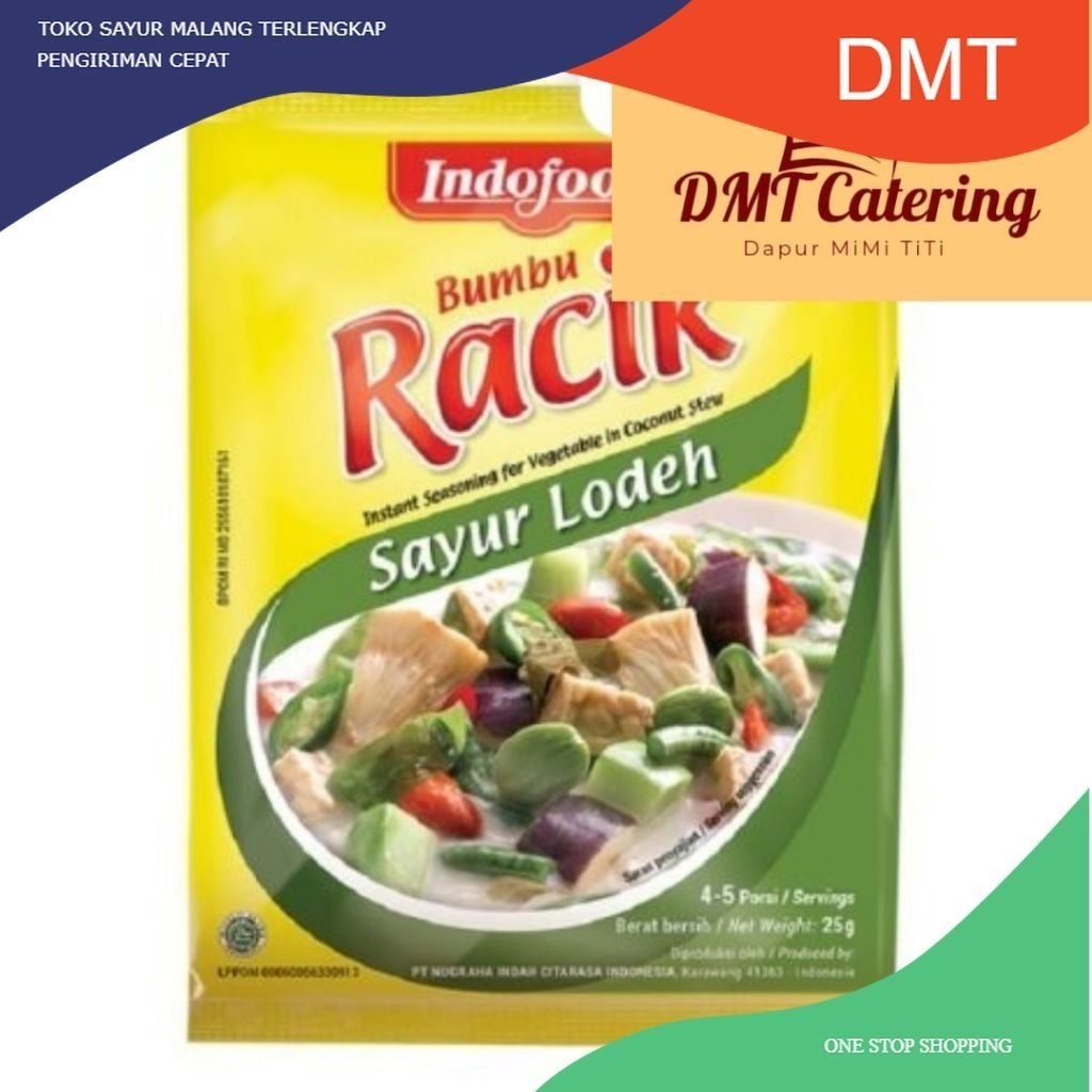 Indofood Bumbu Racik Sayur Lodeh terbuat dari bahan pilihan seperti bawang merah, gula, garam, minyak nabati, bawang putih, daun serai, daun salam. Diproses secara higienis, menghasilkan rasa yang nikmat seperti cita rasa khas Indonesia.