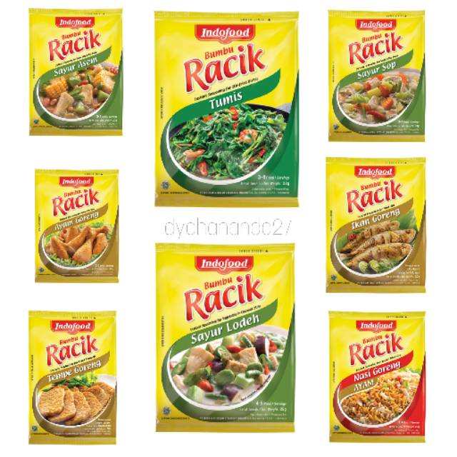 Bumbu instan Indofood Racik merupakan varian bumbu Indofood untuk beragam masakan sehari-hari, seperti sayur sop, tempe goreng, ayam goreng, nasi goreng, sayur asem, ikan goreng, dan sayur lodeh. Bumbu ini dibuat berbentuk bubuk, dikemas dalam sachet kecil berukuran 20 – 30 gram, dan cukup untuk 2-3 porsi masakan. Sedangkan bumbu racik spesial ditujukan untuk masakan yang memerlukan banyak rempah, seperti rendang, rawon, opor ayam, kare, dan gulai. Oleh karena itu, bumbu racik spesial dibuat dalam bentuk pasta dan dikemas dalam berat bersih cukup banyak.