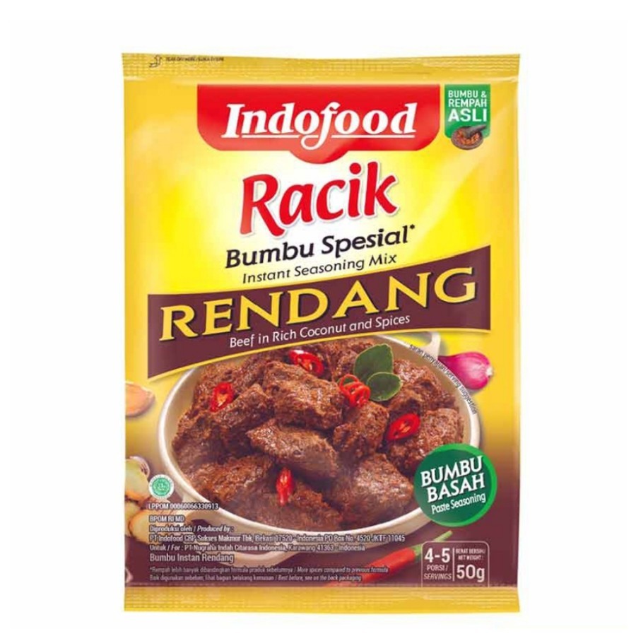 Indofood Racik Bumbu Spesial Rendang 50 g adalah salah satu bumbu instan yang dipersembahkan oleh Indofood untuk masakan rendang yang lezat dan nikmat. Bumbu Indofood ini diracik dari perpaduan bumbu dan rempah-rempah alami yang segar. Perpaduan tersebut dihasilkan dari pasteurisasi yang menjaga kesegaran rempah. Tanpa dapur yang berantakan dan dengan waktu yang cepat, Anda dapat menyajikan masakan rendang yang lezat memikat. Bumbu instan ini terjamin aman karena diracik tanpa bahan pengawet dan pewarna, serta mendapatkan sertifikat hahal dari Majelis Ulama Indonesia (MUI). Rendang yang biasanya dimasak dengan waktu yang sangat lama kini dapat tersaji dalam beberapa menit saja. Hidangkan rendang kesukaan keluarga Anda bersama lezatnya Indofood Bumbu Rendang.