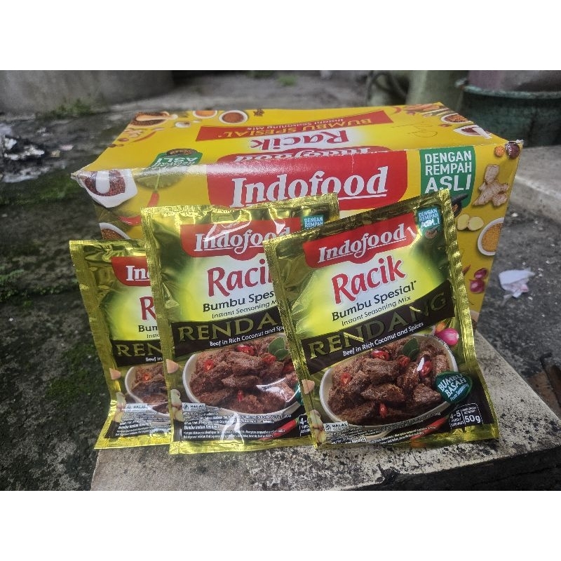 Bumbu spesial indofood racik Rendang (Bumbu Basah) kemasan 50 gram , praktis tinggal dipakai untuk semua olahan daging sebagai persiapan Idul Adha .