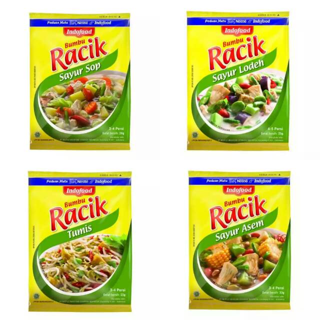 Indofood Racik seri sayur yang terdiri dari Bumbu Racik sayur asem, sayur sop, sayur lodeh, serta tumis. Kini hadir paduan bumbu dan rempah-rempah asli sop. Cukup 1 sachet, satu hidangan sayur sop lezat cepat tersaji. Tak perlu tambahan bumbu lainnya. Cukup siapkan bahan-bahan seperti wortel, buncis, kol, daun sop, kentang, ayam, dan lain sebagainya. Lalu taburkan 1 sachet Racik Sayur Sop dan masak hingga matang. Tersedia dalam kemasan sachet 20 gr, cukup untuk 3-4 porsi.