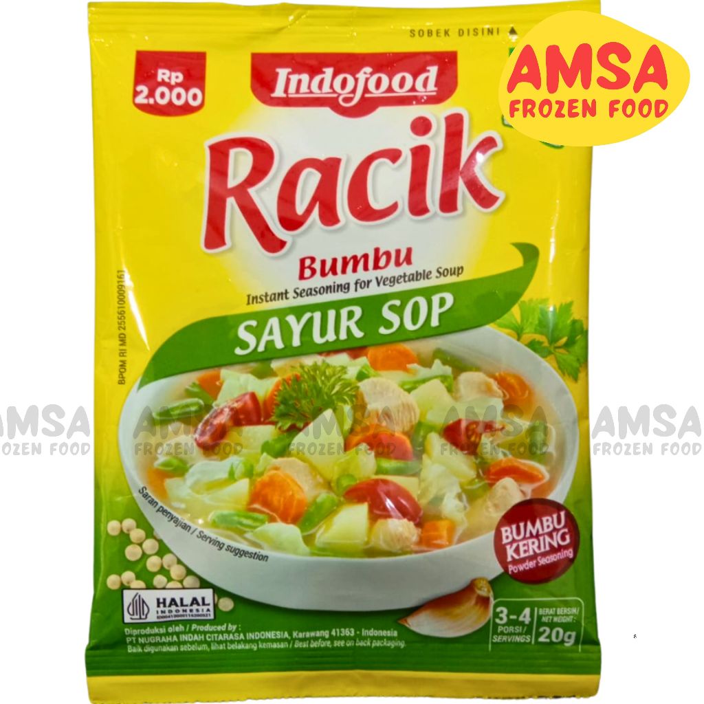1 bungkus Bumbu RACIK Sayur Sop cukup untuk 1x masak untuk 3-4 porsi. Cocok untuk aneka jenis sop seperti sop ayam, sop jagung, sop makaroni, dan kreasi sop favorit keluarga.
