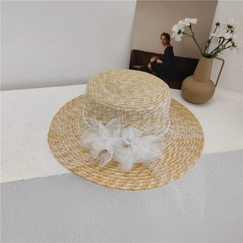 Ins шикарная летняя женская шляпа-федора с большим кружевным цветком и жемчужной лентой из натуральной соломы, женская Панама для отдыха, джазовая шляпа head size 57cm