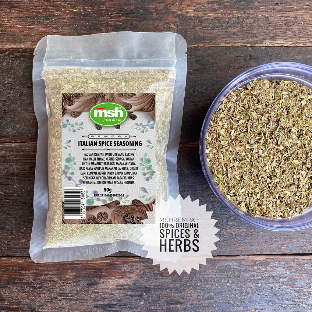 Italian Spice Seasoning merupakan paduan rempah daun oregano kering dan daun thyme kering sebagai bahan untuk membuat berbagai masakan Italia baik pasta maupun masakan lainnya. Dibuat dari rempah murni tanpa bahan campuran, sehingga menghadirkan rasa yang khas. Rempah murni dikemas secara higienis.