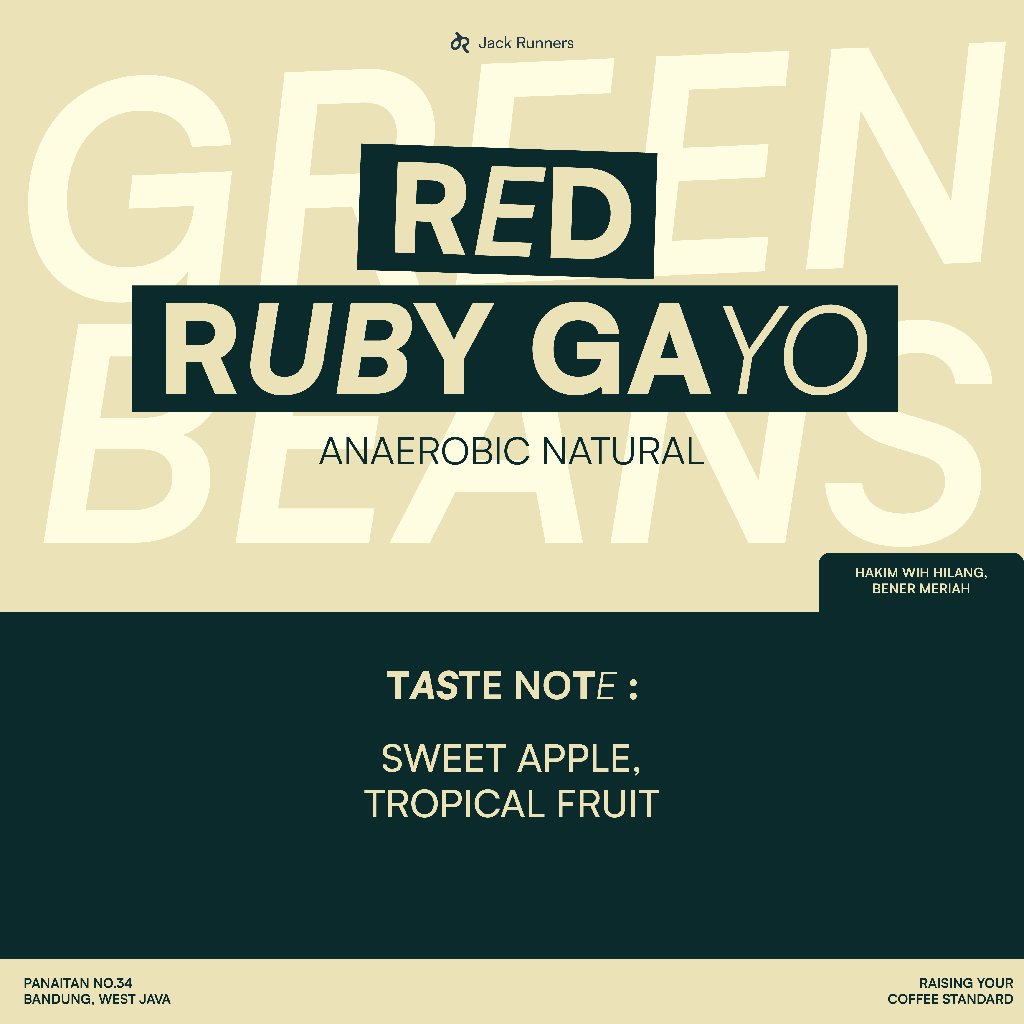 RED RUBY GAYO Merupakan kopi mentah yang berasal dari Aceh, gayo, dengan proses Natural Anaerob, yang membuat cita rasa kopi nya fruity, karena akan mengandung rasa strawberry, watermelon, dan grape