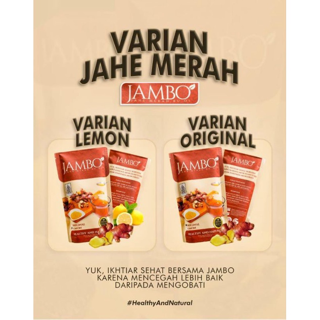 JAMBO LEMON merupakan prodyk varian dari JAMBO yang terbuat dari 100% jahe merah pilihan, lemon dengan campuran gula aren.dan sereh.