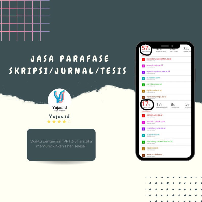 Halo gais, Untuk Parafase kita cek dulu nanti yaa filenyaa berapa halaman untuk harganya 350k - 450k sesuai dengan banyak plagiat dan halaman filenya, untuk parafase kita hanya menyediakan teknik parafase similiar yaitu dengan mengganti kata kata nya satu persatu agar tidak ada nya unsur kecurangan pada saat di cek ☺️