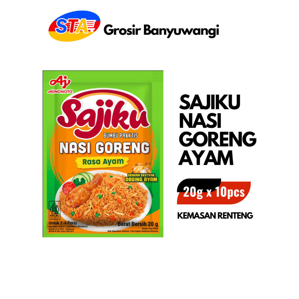 Sajiku Bumbu Praktis Nasi Goreng Ayam adalah bumbu praktis yang dibuat dengan Ekstrak ayam dan rempah, membuat rasa Nasi Goreng jadi Lezat dan Nikmat, tanpa tambahan bumbu lainnya.