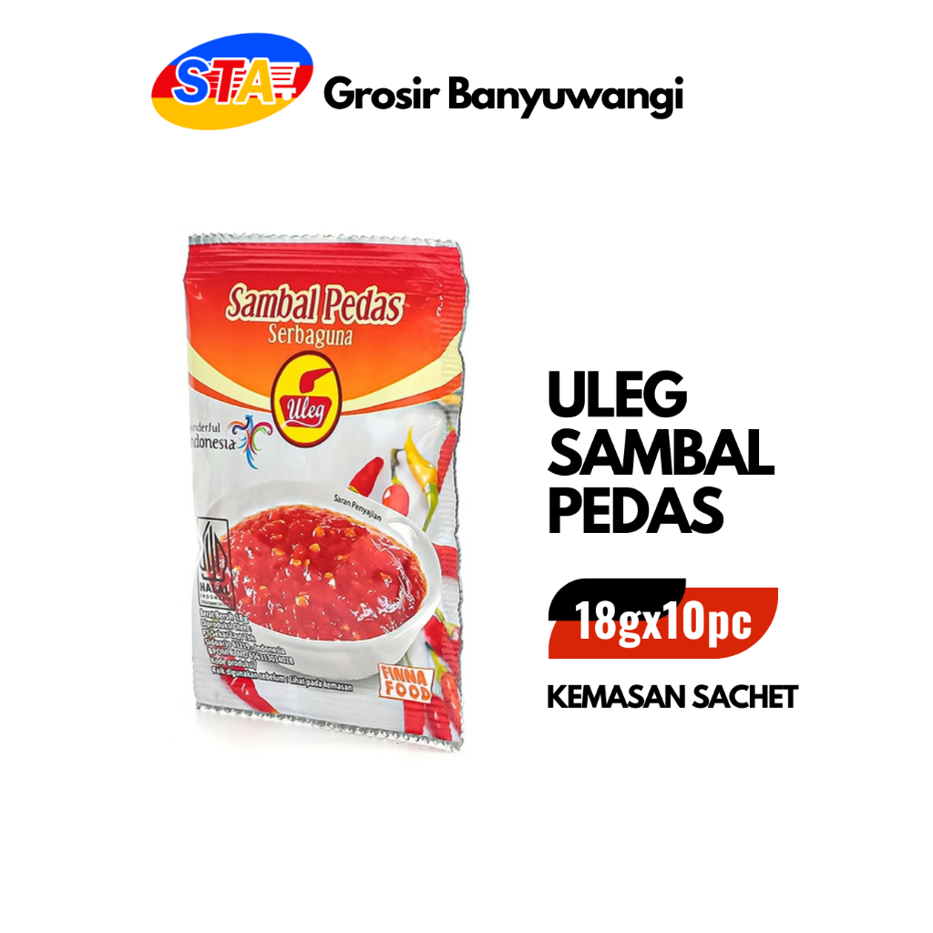 Uleg Sambal Pedas Serbaguna adalah sambal keluaran FINNA yang menyuguhkan cita rasa sambal pedas ala rumahan dalam kemasan. Diolah dari cabai pilihan dan dikombinasikan dengan bumbu berkualitas, sambal ini dapat digunakan sebagai bumbu masakan atau pelengkap makanan sehingga lebih pedas dan sedap. Uleg Sambal Pedas Serbaguna dikemas dalam kemasan sachet sehingga praktis dan mudah dibawa.