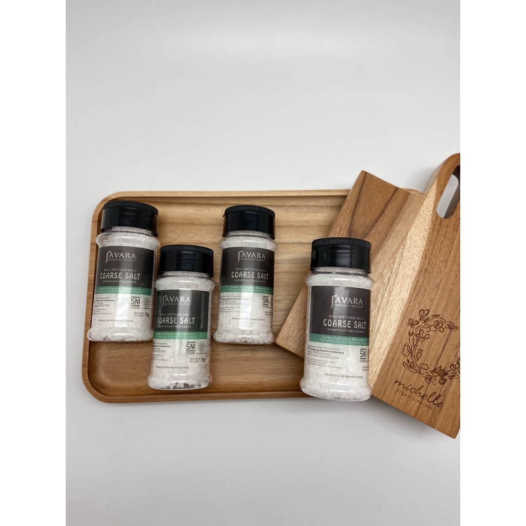 Javara Coarse Salt dipanen dari air laut sulingan yang telah diuapkan yang telah dikeringkan di dalam bejana yang terbuat dari batang pohon kelapa.
