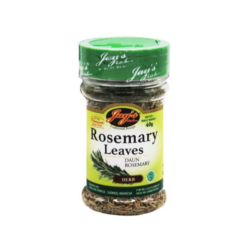 Jay's Rosemary Leaves 40 g merupakan bumbu daun rosemary yang memiliki aroma yang khas, hangat, dan kaya akan rasa. Bubuk bumbu daun rosemary ini dapat digunakan sebagai penyedap makanan. Bumbu ini terbuat dari bahan murni pilihan dan berkualitas serta diproduksi dengan mesin modern dan tanpa pengawet.